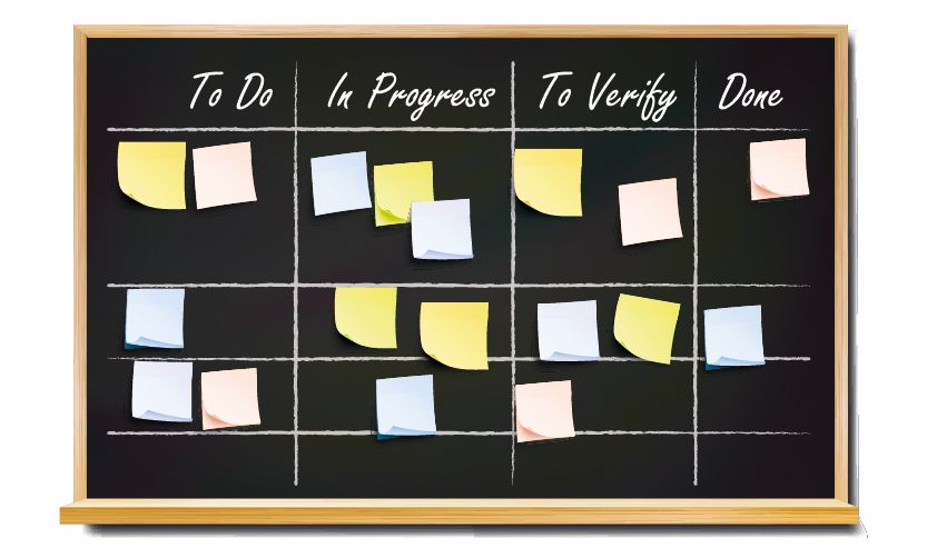 Kanban ist also eine ToDo-Liste, die die Aufgaben in einem Prozess darstellt. Das Board, das entweder analog an der Wand oder digital mit entsprechenden Tools realisiert werden kann, ist für alle Teammitglieder einsehbar, so dass jeder immer das gesamte Projekt vor Augen hat.