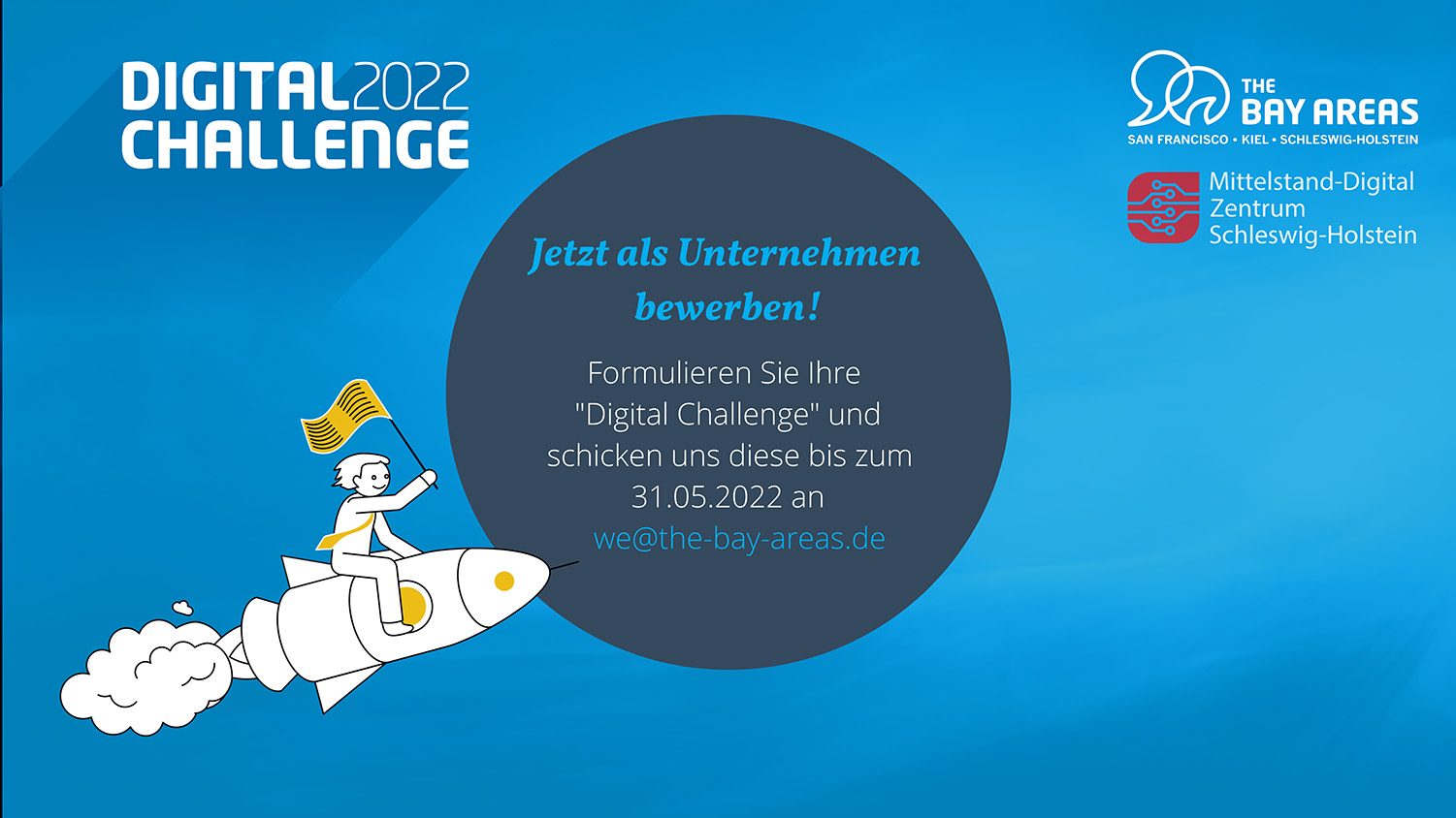 Gemeinsam richten das Mittelstand-Digital Zentrum Schleswig-Holstein und der Verein The Bay Areas vom 26. Oktober bis 04. November 2022 die diesjährige Digital Challenge an den Standorten Heide, Flensburg, Kiel und Lübeck aus. Unterstützt werden die beiden Ausrichter dabei von den jeweiligen Hochschulen der Standorte.