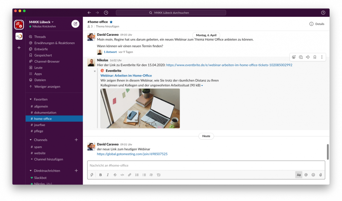 Aus diesen Gründen haben wir uns dazu entschieden zunächst im experimentellen Rahmen neuartige Kommunikationslösungen zu nutzen. Genauer gesagt haben wir für circa vier Wochen Slack im Mittelstand 4.0-Kompetenzzentrum Kiel-Team (M4KK) der UniTransferKlinik Lübeck und Universität zu Lübeck eingesetzt. Slack ist eine Kommunikationslösungen für Unternehmen, über die Textnachrichten, Bilder und Dokumente verschickt werden können. Hierbei ist ein Slack-Workspace jeweils nur einem Unternehmen zugewiesen und nur für dessen Mitarbeiter zugänglich.