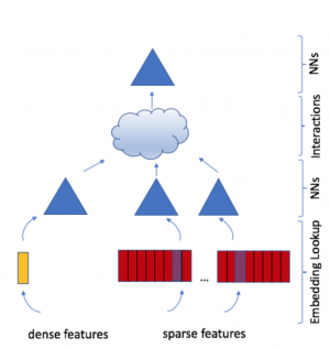 Hierbei sind die quantitativen Merkmale orange und die kategorialen rot dargestellt. Beide Arten der Information werden anschließend durch kleine Neuronale Netze verarbeitet (Dreiecke), kombiniert (Wolke) und zuletzt durch ein weiteres Neuronales Netz verarbeitet. Am Ende erfolgt die Ausgabe, wie gut die Merkmale zueinander passen und insofern wie empfehlenswert das Produkt (Item) für den Nutzer (Query) ist. Die Verarbeitung erfolgt prinzipiell für eine Query und ein Item. Das heißt, die Merkmale von dem Item und von der Query werden in das System gegeben und das System gibt eine Zahl aus, die beschreibt, wie gut diese zusammenpassen. Dies kann beispielsweise für eine Query und viele Items gleichzeitig erfolgen und anschließend wird das Item mit dem höchsten Wert für die Query empfohlen.