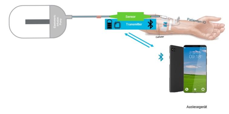 Die konzipierte Lösung besteht aktuell aus drei Komponenten, einem Sensor, dem Transmitter (Mikrokontroller) und einem Auslesegerät. Der Durchfluss-Sensor misst den Infusionsverlauf und sendet die Daten mittels Bluetooth Low Energy (BLE) an den Transmitter und von dort an ein Auslesegerät.