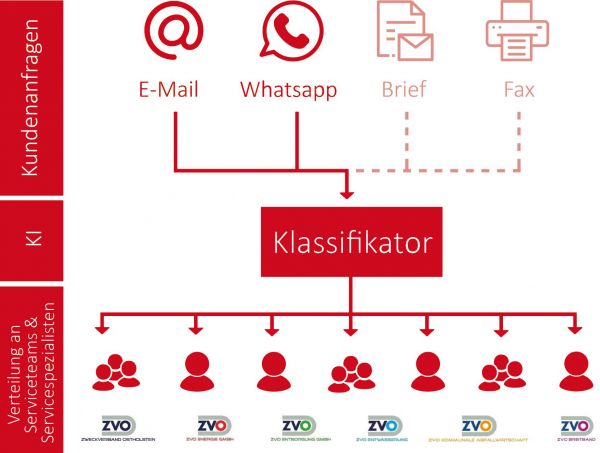 Eine gute Erreichbarkeit und Kommunikation mit dem Kunden sind für den ZVO selbstverständlich. Rund 150.000 Kundenanfragen erreichen den ZVO jährlich über die verschiedenen Kommunikationskanäle zu den unterschiedlichsten Themen; z.B. zu Energielieferungen, Hausanschlüssen, Sperrmüllabholung bis hin zu Jobanfragen. Das macht rund 410 Nachrichten pro Tag – schließlich sind im digitalen Zeitalter Wochenenden und Feiertage irrelevant. All diese Anfragen gilt es, schnell und sicher an die verantwortlichen Mitarbeiter*innen weiter zu leiten. Vor dem Hintergrund des breiten Portfolios und der Vielzahl der Kommunikationskanäle eine Herausforderung. „Die Kontaktpunkte unserer Kunden haben sich erheblich erhöht“, so René Schlichting, Manager für Digitalisierung und Innovation beim ZVO. „Waren es früher vor allem Telefon, Brief und Fax, so sind diese ergänzt oder abgelöst durch E-Mail und WhatsApp. Dabei die Kundenbindung nachhaltig zu gestalten, ist unser erklärtes Ziel. Aus diesem Grund haben wir ein Projekt initiiert, um zu erkennen, ob wir mit KI-Methoden die Kommunikation optimieren und die Kundenzufriedenheit steigern können.“